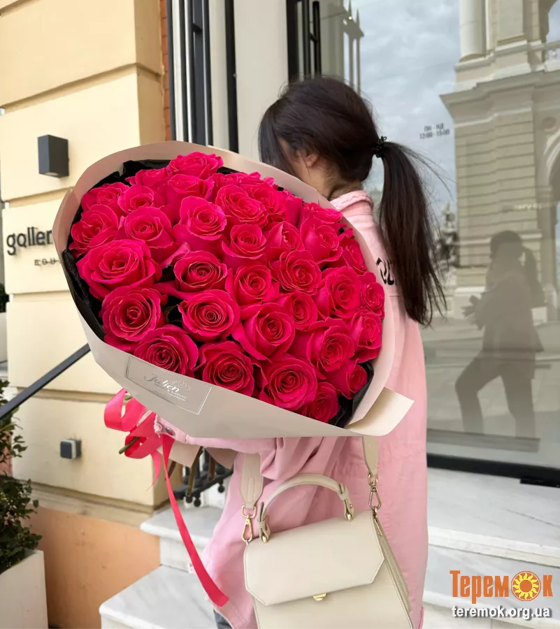 Подарите яркие эмоции с элегантным монобуктетом из малиновой розы — символом нежности, страсти и изысканного вкуса.