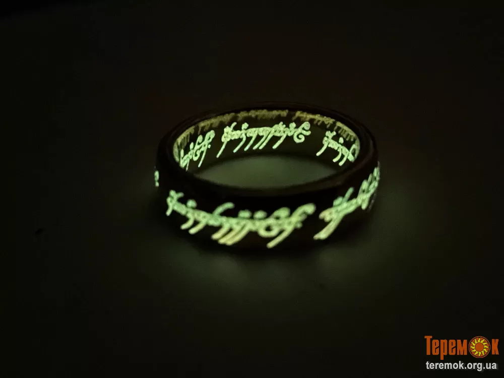 Двустороннее кольцо, вдохновленное легендарной Властелин колец, украшенное светящимися в темноте рунами.