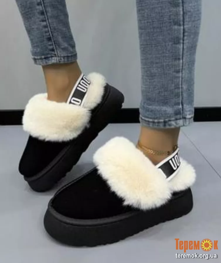 Стильні актуальні короткі угги чорного кольору на високій фабрично- пролитій пласкій подошав, щ контрастним молочним хутром, ззаду на широкій, фіксуючій п'ятку, резинці. Розмір 40-41, на стопу 24,5- 25 -25,5 см. Нові.