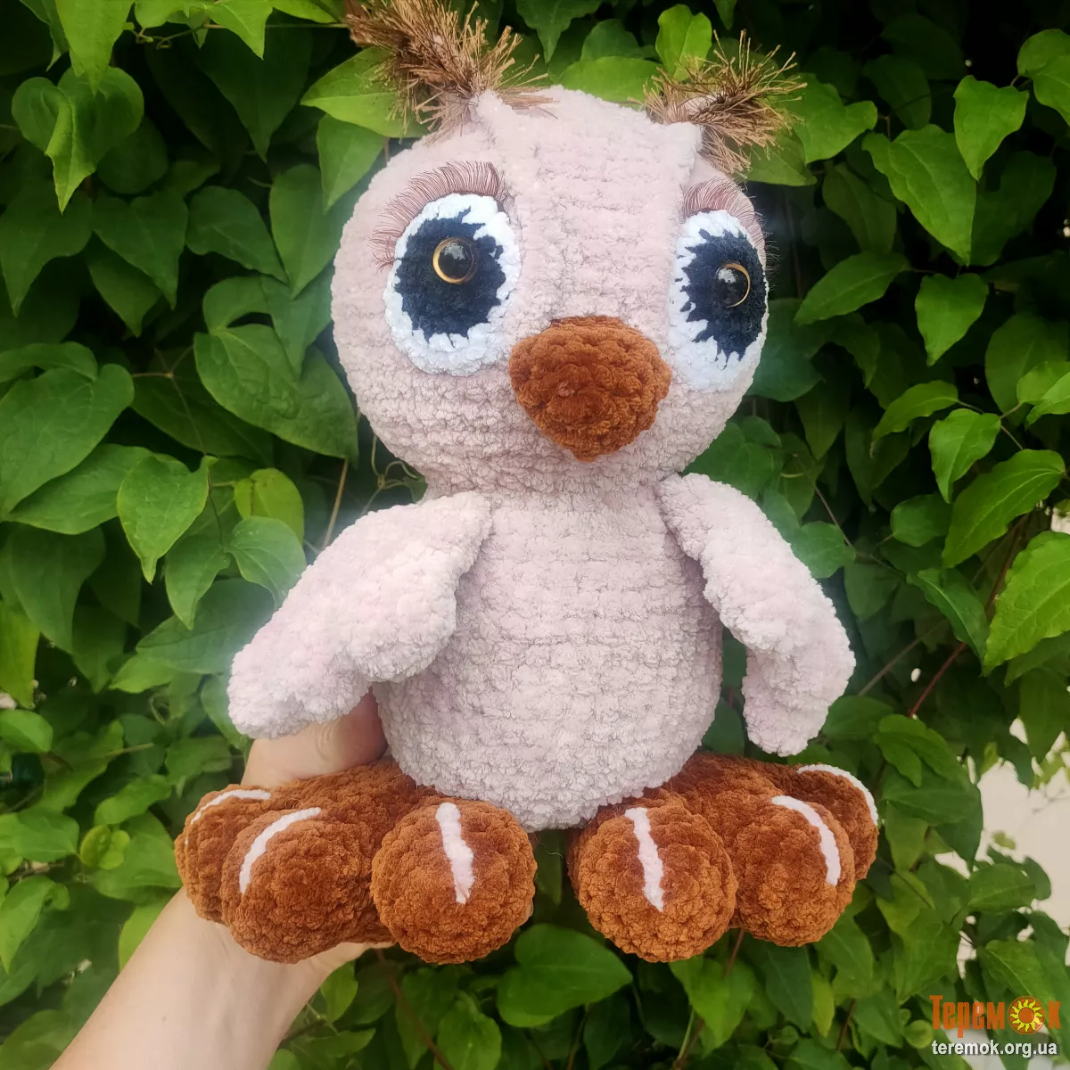 очі в'язані.на безпечному кріпленні,клюв вязаний ,крила та лапки пришиті,без каркаса,сама стоїть.