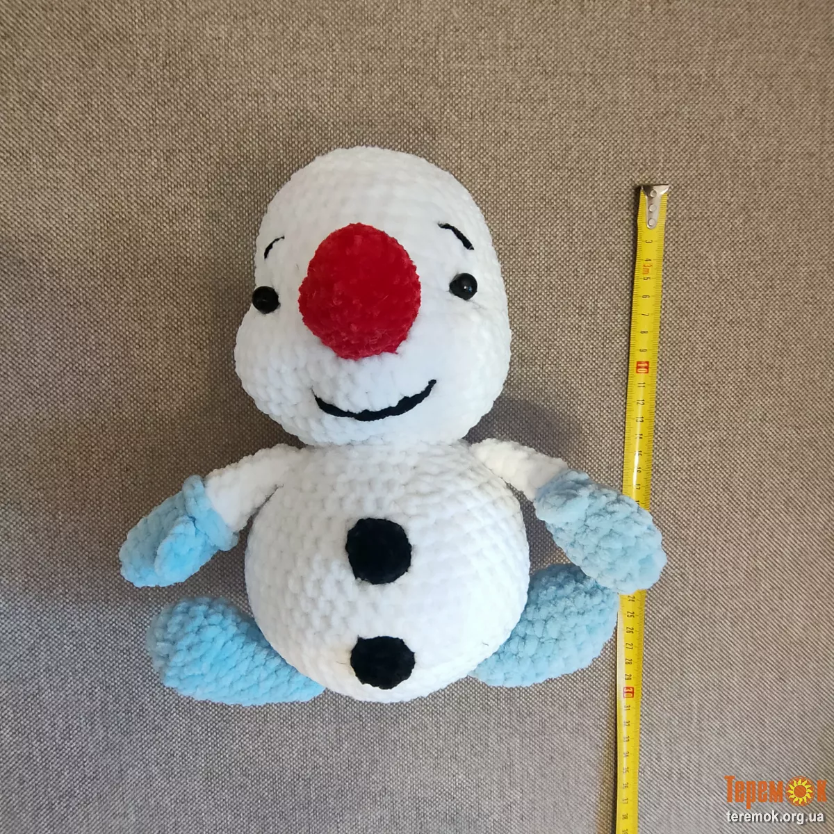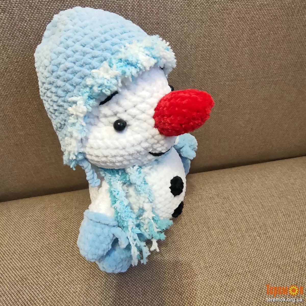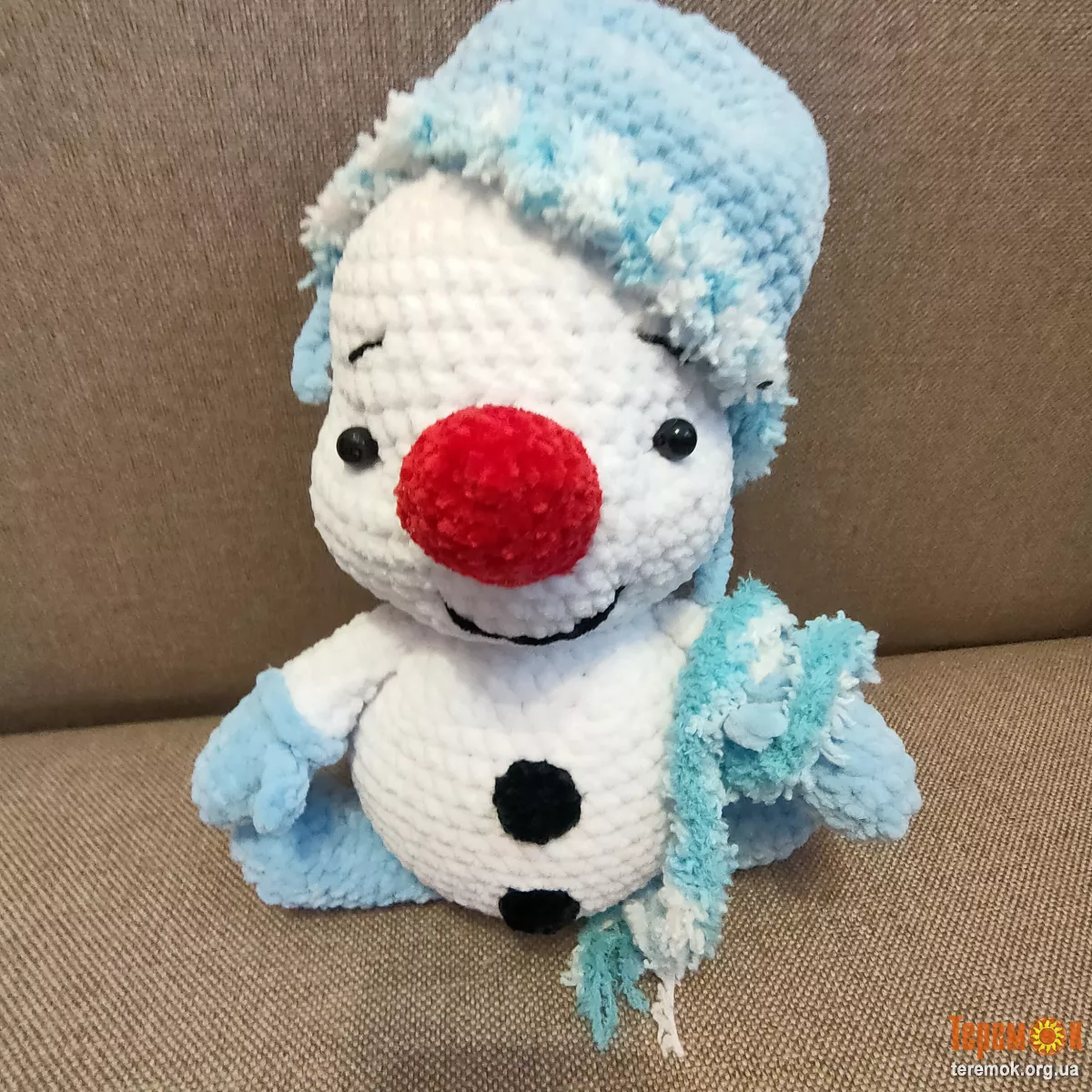 наповнювач холлофайбер,носик морковка і гудзики вязані, очі бусінки- пришиті,шапочка і шарф знімаються