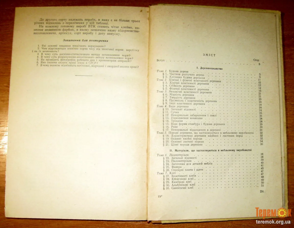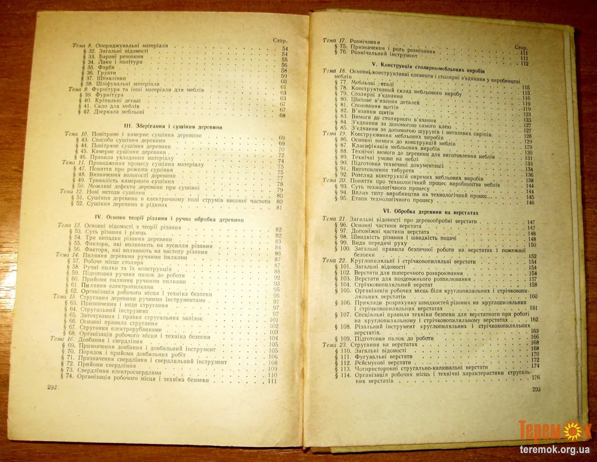 Посібник включає розділи: "Деревознавство", "Матеріали, що застосовуються в меблевому виробництві", "Зберігання та сушіння деревини", "Основи теорії різання та ручна обробка деревини", "Конструкція столярно-меблевих виробів", "Обробка деревини на верстатах", "Складальні роботи".