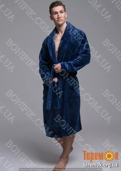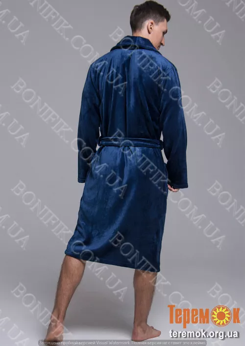 Елегантний комірець-шалька, пояс на талії та глибокі кишені роблять халат не тільки зручним, але і по справжньому чоловічим.