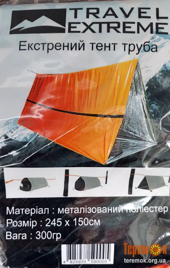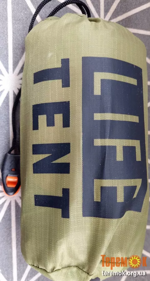 Рятувальний тент у вигляді труби. За допомогою шнурка натягнутого між двома опорами може бути встановлений в якості двухскатного тенту з дном.