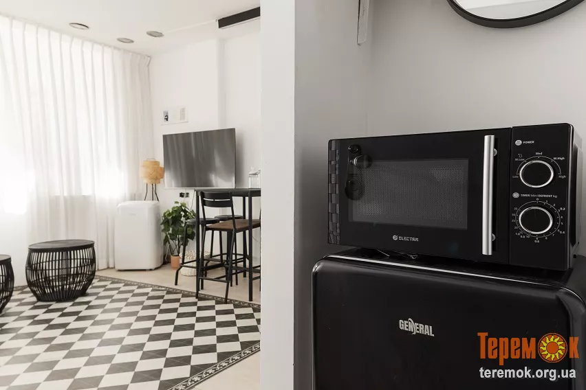 Все необходимые электротовары: телевизор, холодильник, микроволновая печь, кофемашина, электрочайник, кондиционер.