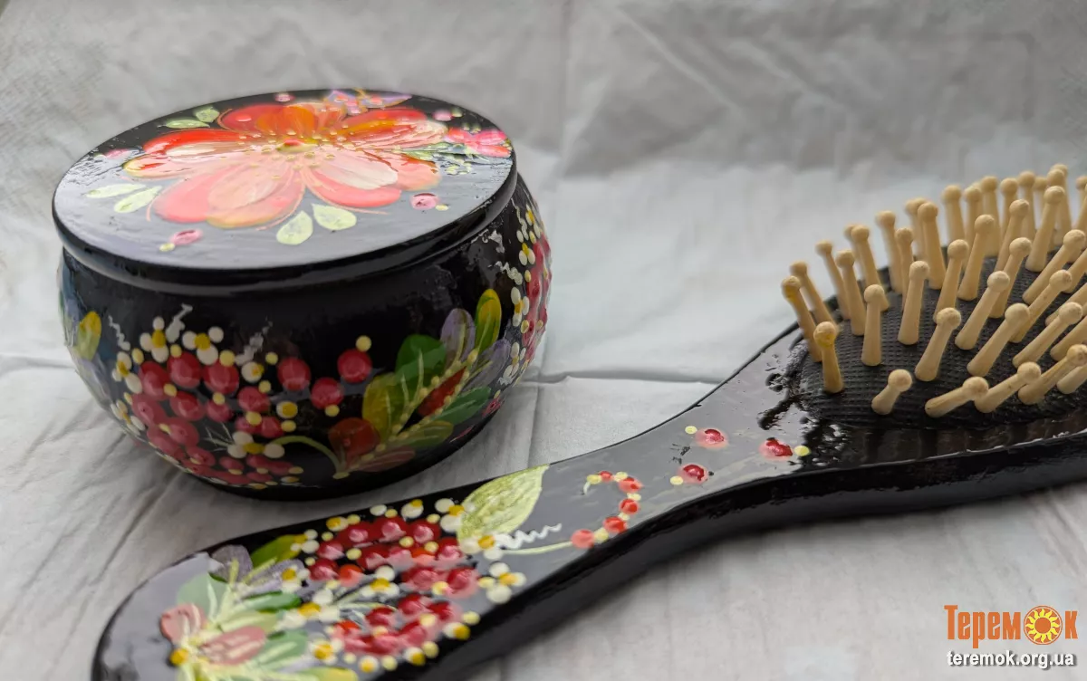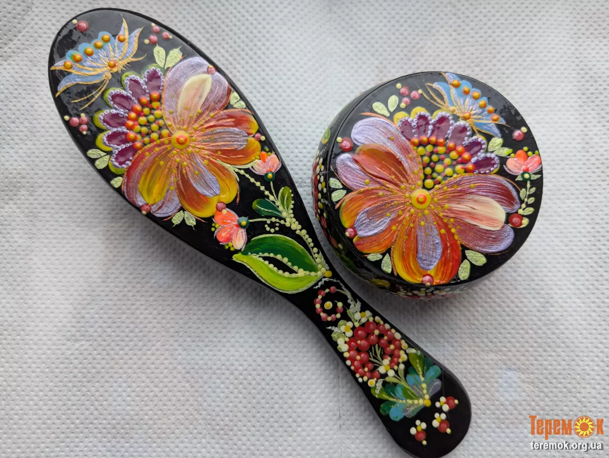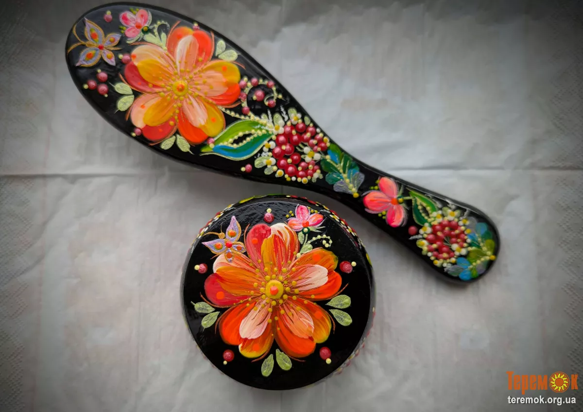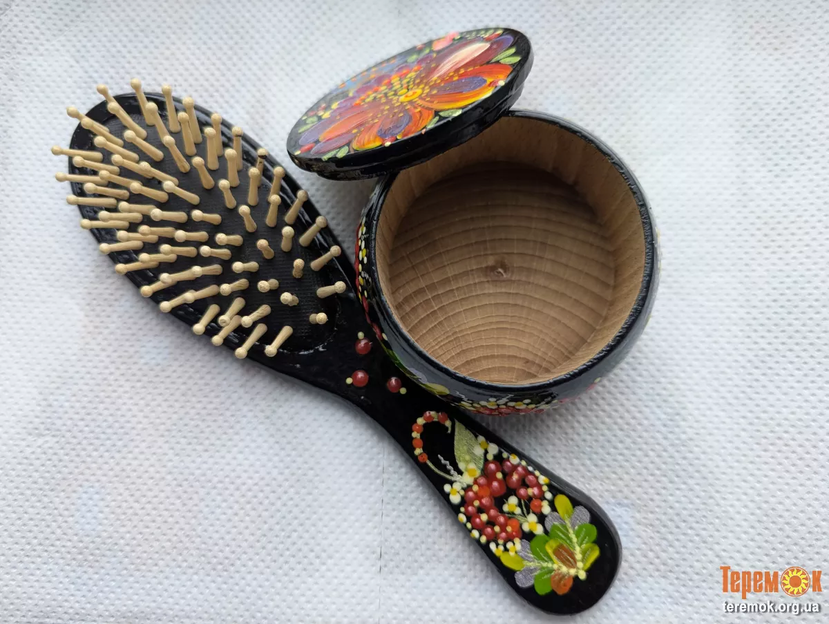 Жіночий набір з бука: масажна щітка 21*6см, д. 8,5см, фарби акрилові стійкі, покрито три рази лаком. З початку пишіть у чат або вайбер. На першому фото продався.