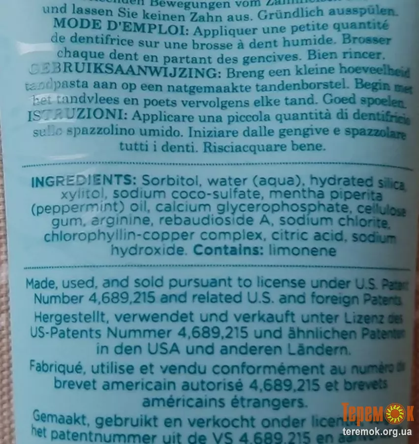 СКЛАД: Sorbitol Water (aqua) Hydrated silica, Xylitol, Sodium coco-sulfate, Mentha piperita (peppermint) олія, Calcium glycerophosphate, Cellulose gum, Arginine, Rebaudioside A, Sodium chlorite, Chlorophyllin-copper complex, citric hydric-copper complex. Contains: limonene