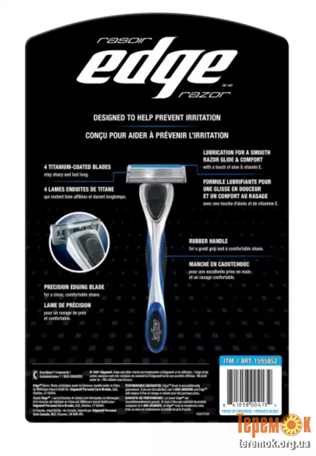 Бритва Edge - це міцна бритва з чотирма лезами з покриттям титану, які залишаються гострими для зниження подразнення. Лезо з краєм забезпечує додаткову точність у важкодоступних місцях, а ергономічно спроектована рукоятка дає користувачеві додатковий контроль.