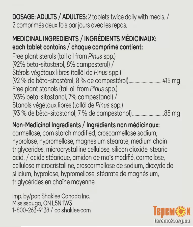*Продукти, що містять 800 мг рослинних стеролів і станолів на день, що приймаються з двома різними стравами в рамках дієти з низьким вмістом насичених жирів та холестерину, можуть знизити ризик серцево-судинних захворювань. Комплекс для зниження холестерину щодня забезпечує 2000 мг рослинних стеролів та станолів при правильному застосуванні (тобто 2 таблетки двічі на день разом із прийомом їжі).