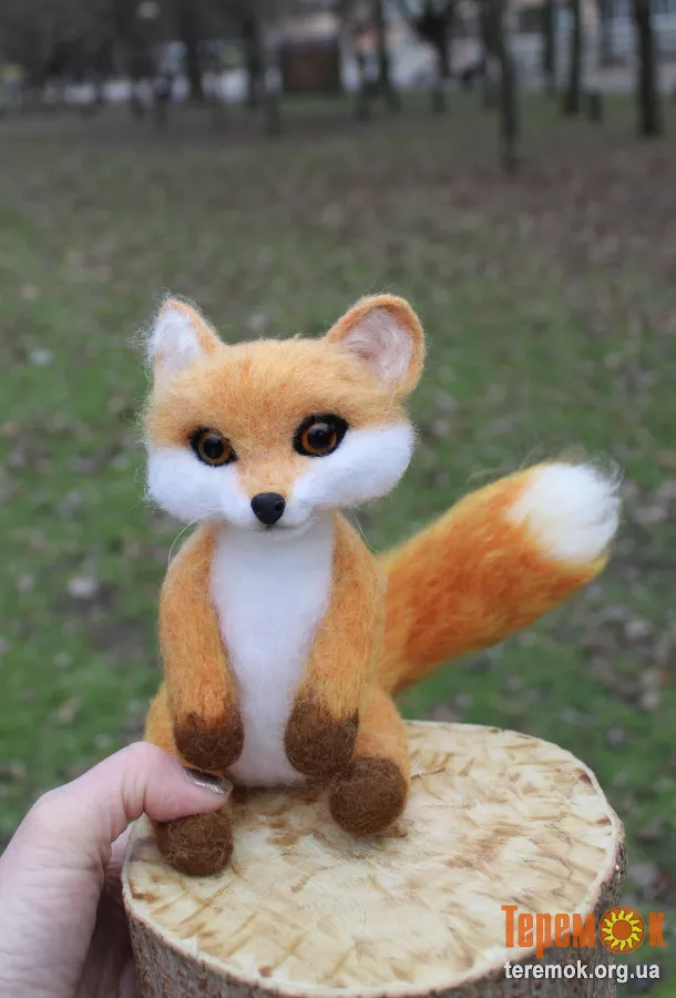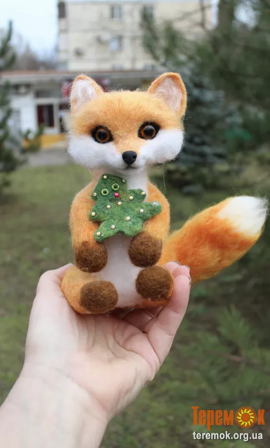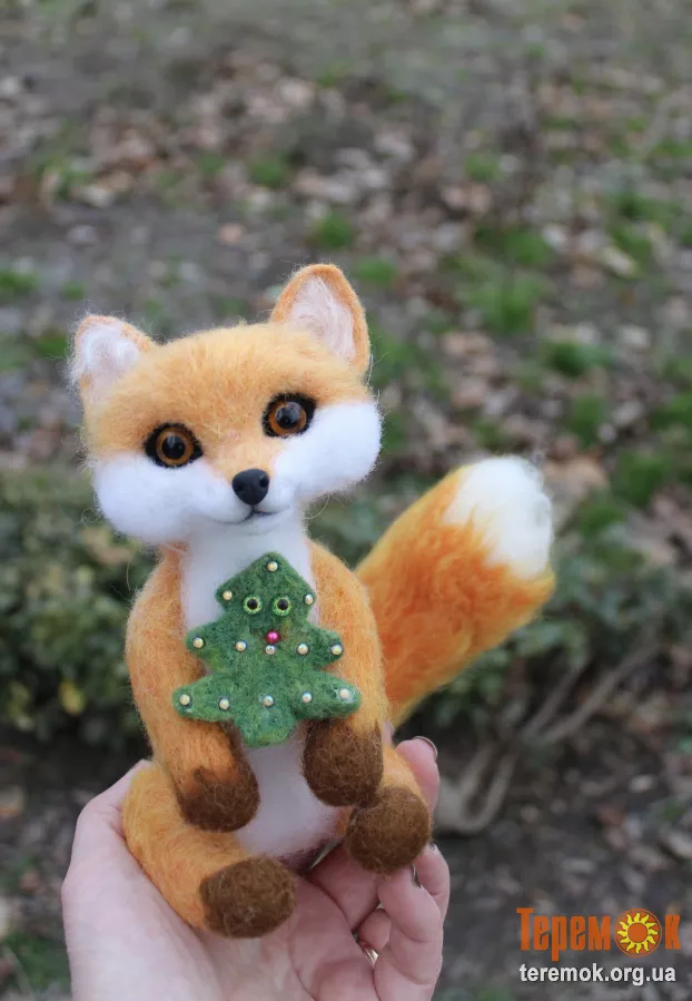 Лисенок з ялинкою іграшка валяна з шерсті інтерєрна . На каркасі, носик ручної лепки та розпису, дуже блискуча та шовковисто шерстяна лисичка. Висота 17 см ( голова і туловище без учена задніх лап )+ шикарний хвіст у красуні. В подарунок йде ялиночка з зеленими оченятами, вона знімається і може використовуватися як окрема прикраса. Позитивна лисичка гарна прикраса інтерʼєру і чудовий подарунок як дорослому так і дитині. Іграшка інтерʼєрна лиса.