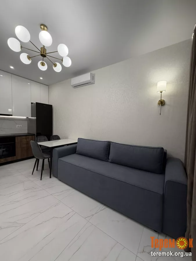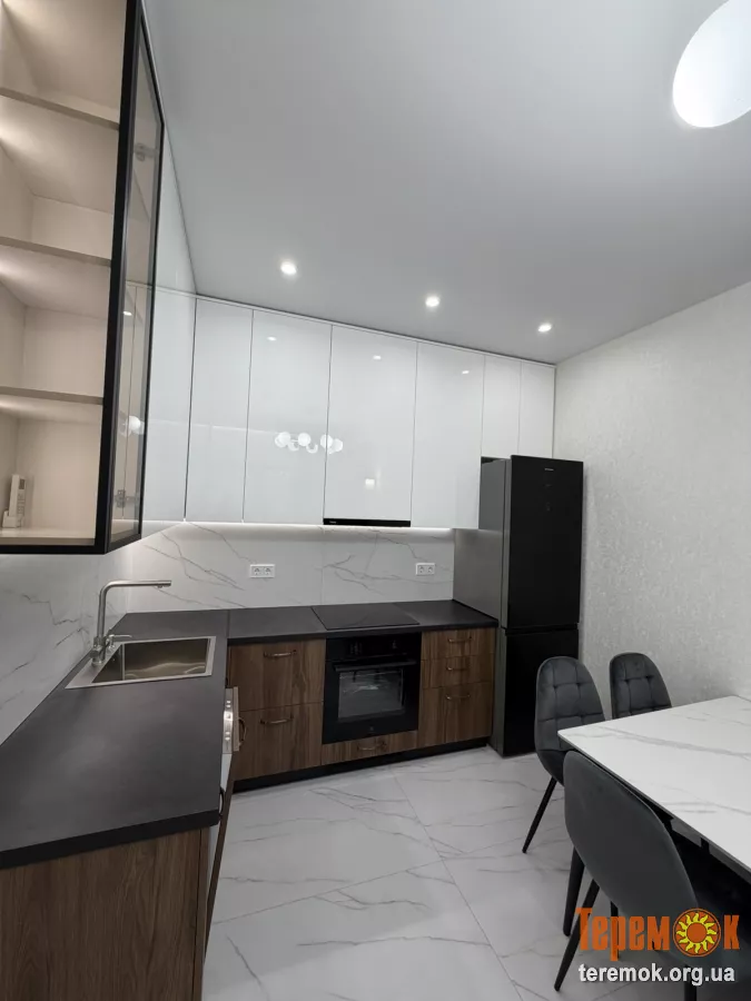 кухня-вітальня: вбудована кухня, варильна поверхня, духовка, посудомийка, великий холодильник, стіл з кам'яною стільницею, стільці, диван розкладається. З кухні студії вихід на балкон. За документами переуступка, телефонуйте оперативний показ.