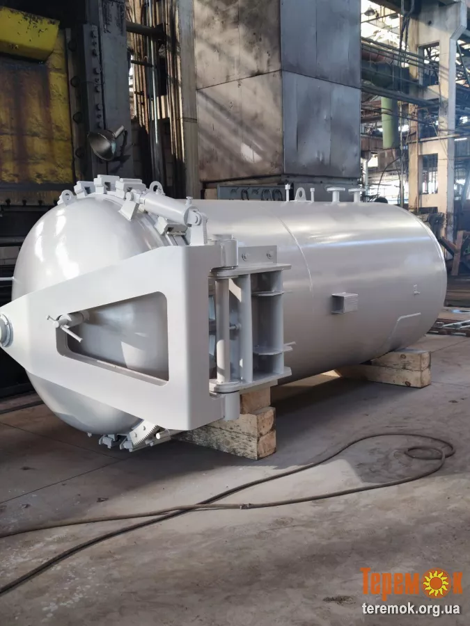 Автоклав горизонтальний з байонетним затвором для скла тріплекс, Ду 1600мм, тиск до 15 атм, температура +150 град, циркуляція повітря в корпусі, запобіжний клапан, датчики температури
