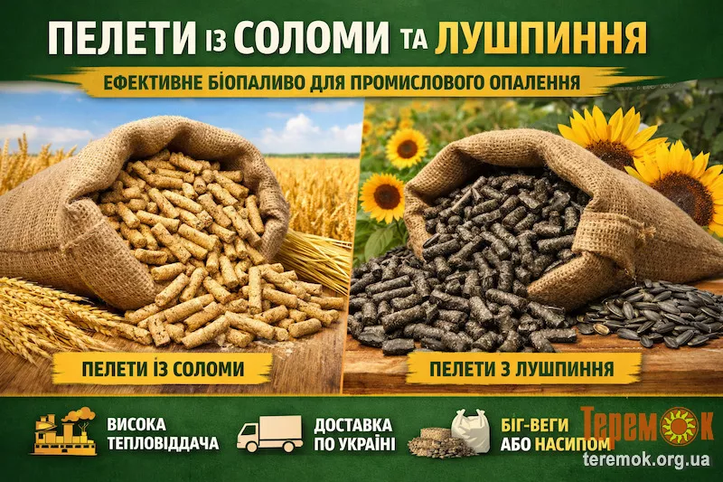 Пелети з соломи та пелети лушпиння — ефективне біопаливо для промислових котелень, агропідприємств і об’єктів біоенергетики.