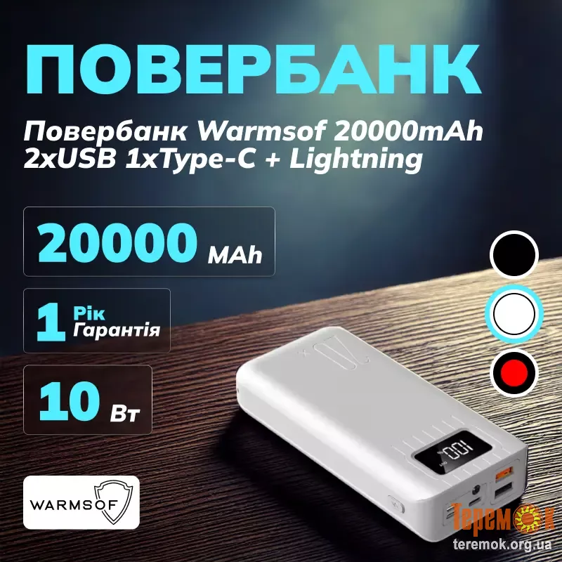Повербанк Warmsof 20000mAh 2xUSB 1хType-C + Lightning з LED-дисплеєм Білий