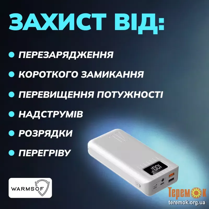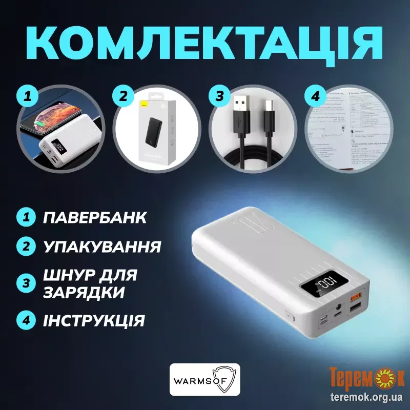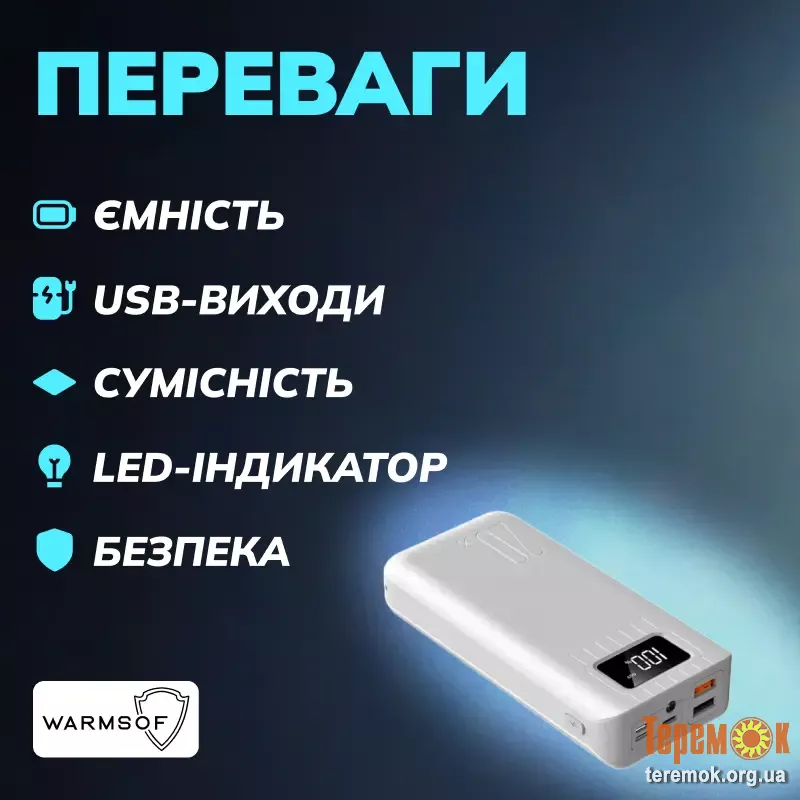 Power Bank Warmsof з ємністю 20000 mAh є потужним та універсальним портативним джерелом живлення. Основні характеристики та параметри включають: