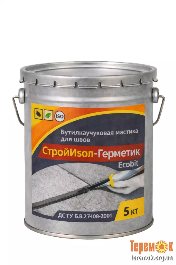СтройИзол-Герметик ЭКОБИТ ведро 5,0 кг бутилкаучуковая мастика для швов ДСТУ Б В.2.7-108-2001 (ГОСТ 30693-2000) Представляет собой вязкую однокомпонентную мастику холодного применения, на основе бутилкаучука, светло серого или серебристого цвета.