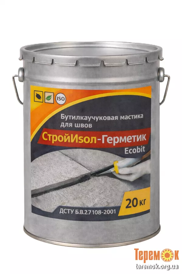 СтройИзол-Герметик ЭКОБИТ ведро 20,0 кг бутилкаучуковая мастика для швов ДСТУ Б В.2.7-108-2001 (ГОСТ 30693-2000) Представляет собой вязкую однокомпонентную мастику холодного применения, на основе бутилкаучука, светло серого или серебристого цвета.
