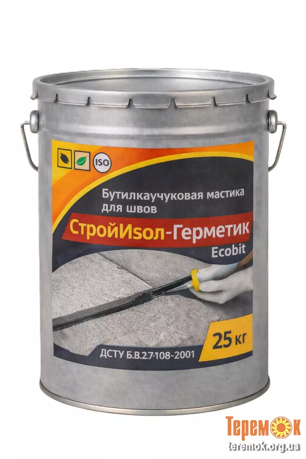 СтройИзол-Герметик ЭКОБИТ ведро 25,0 кг бутилкаучуковая мастика для швов ДСТУ Б В.2.7-108-2001 (ГОСТ 30693-2000) Представляет собой вязкую однокомпонентную мастику холодного применения, на основе бутилкаучука, светло серого или серебристого цвета.