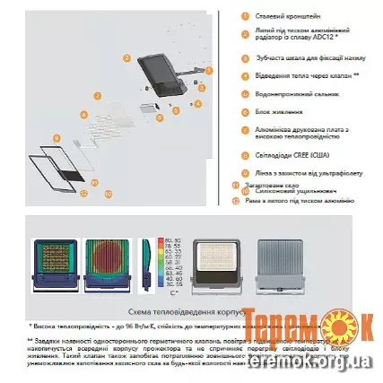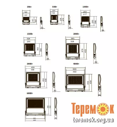 Габаритні розміри (на фото) та вартість прожектора залежать від потужності від 30 до 600 Вт.