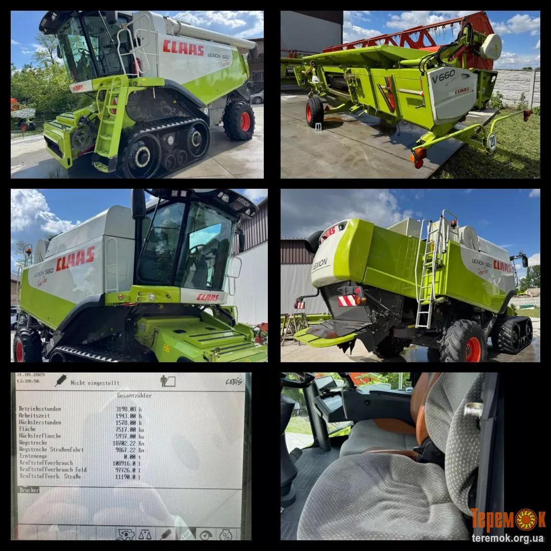 Комбайн Claas Lexion 560 ТТ 2009 рік тільки з Німеччини . 3200/1900 м.г.повний привод, 3~Д вирівнювач, Пилосос, Квантіметер, Жниварка 6,6 м Vario.рапс.візок.в відмінному стані.120000евро 0686513998