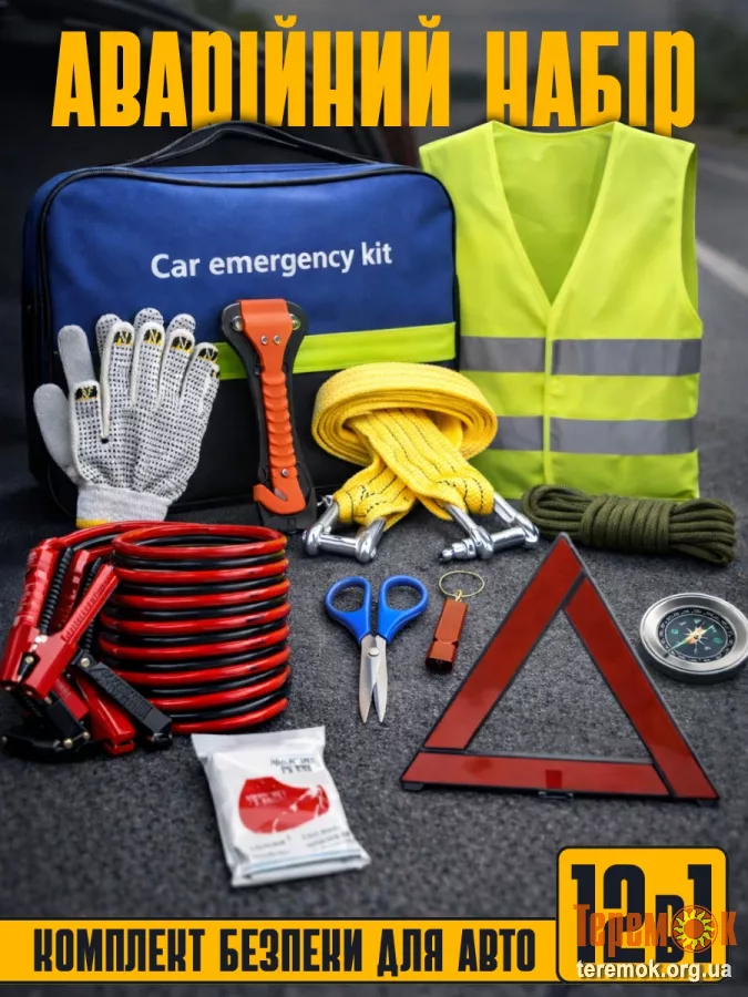 Аварійний набір автомобіліста 12в1 в сумці — продумане рішення для водіїв, які бажають бути готовими до будь-яких ситуацій. В одній компактній сумці зібрано 12 необхідних елементів: від світловідбиваючого жилета та знака аварійної зупинки, до надійних проводів для прикурювання і буксирувального троса