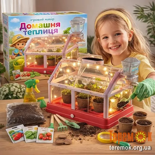 Ігровий набір «Домашня теплиця» створено спеціально для вирощування органічних овочів, ягід та фруктів. У набір юного садівника входить насіння рослин, можна виростити квіти, овочі, пряні трави та живу зелень. У комплекті родючий ґрунт для розсади з поліпшеною формулою, біогоршочки та інструменти.