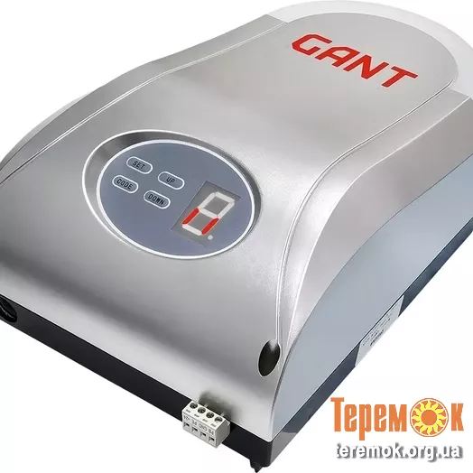 У комплект входить електропривід Gant GM1200 із вбудованим блоком керування та платою радіоуправління з частотою 433,92 МГц, сумісною з аксесуарами Gant. Привід є самоблокуючим, тому після закриття ворота надійно фіксуються і не можуть бути відкриті вручну без спеціального розблокування.