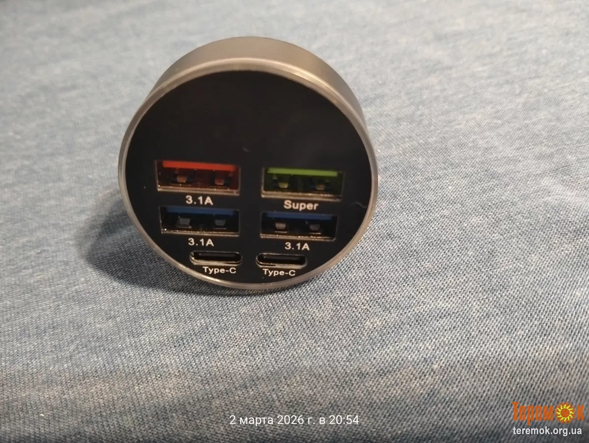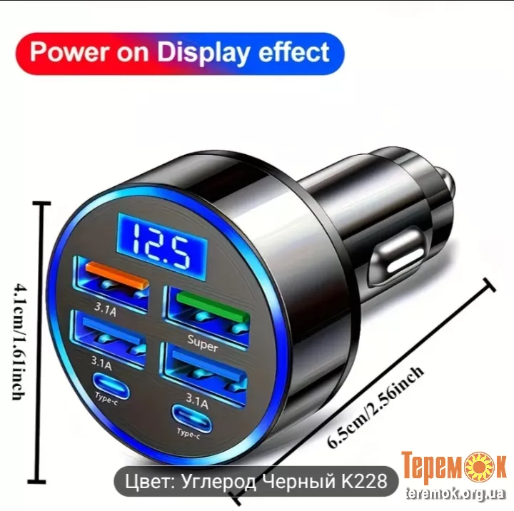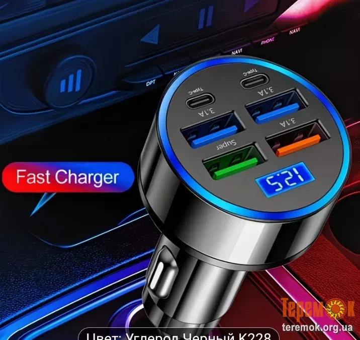 Многофункциональное автомобильное зарядное устройство с 4 USB-портами + 2 портами Type-C, поддерживает быструю зарядку 3.1A, цифровая мигающая светодиодная подсветка, оснащено защитой от перезаряда.