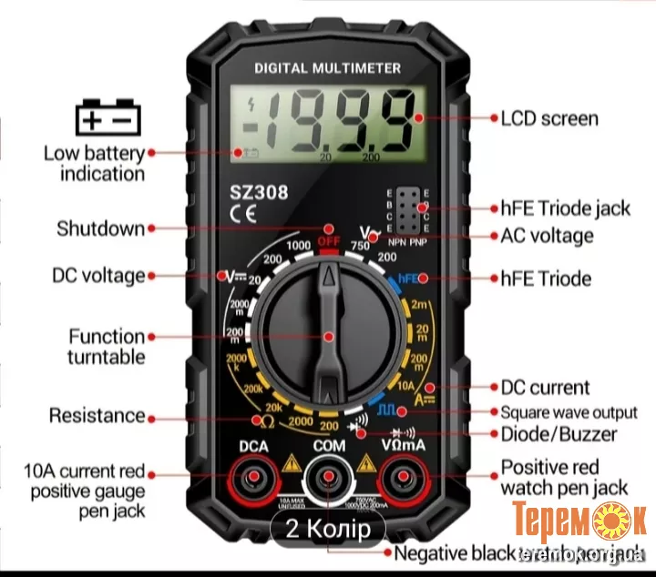 SZ308 Миниатюрный цифровой мультиметр для электротехнического обслуживания, 1999 точек измерения, вольтметр, измеритель тока DC, квадратная волна, инструмент для измерения сопротивления и диодов HFE, триод. Крона в комплекте.