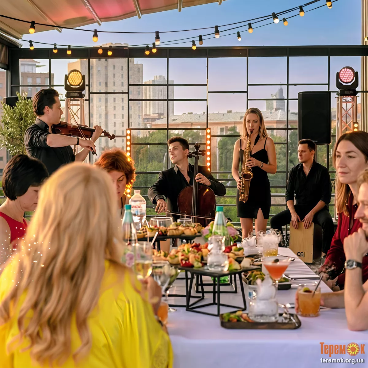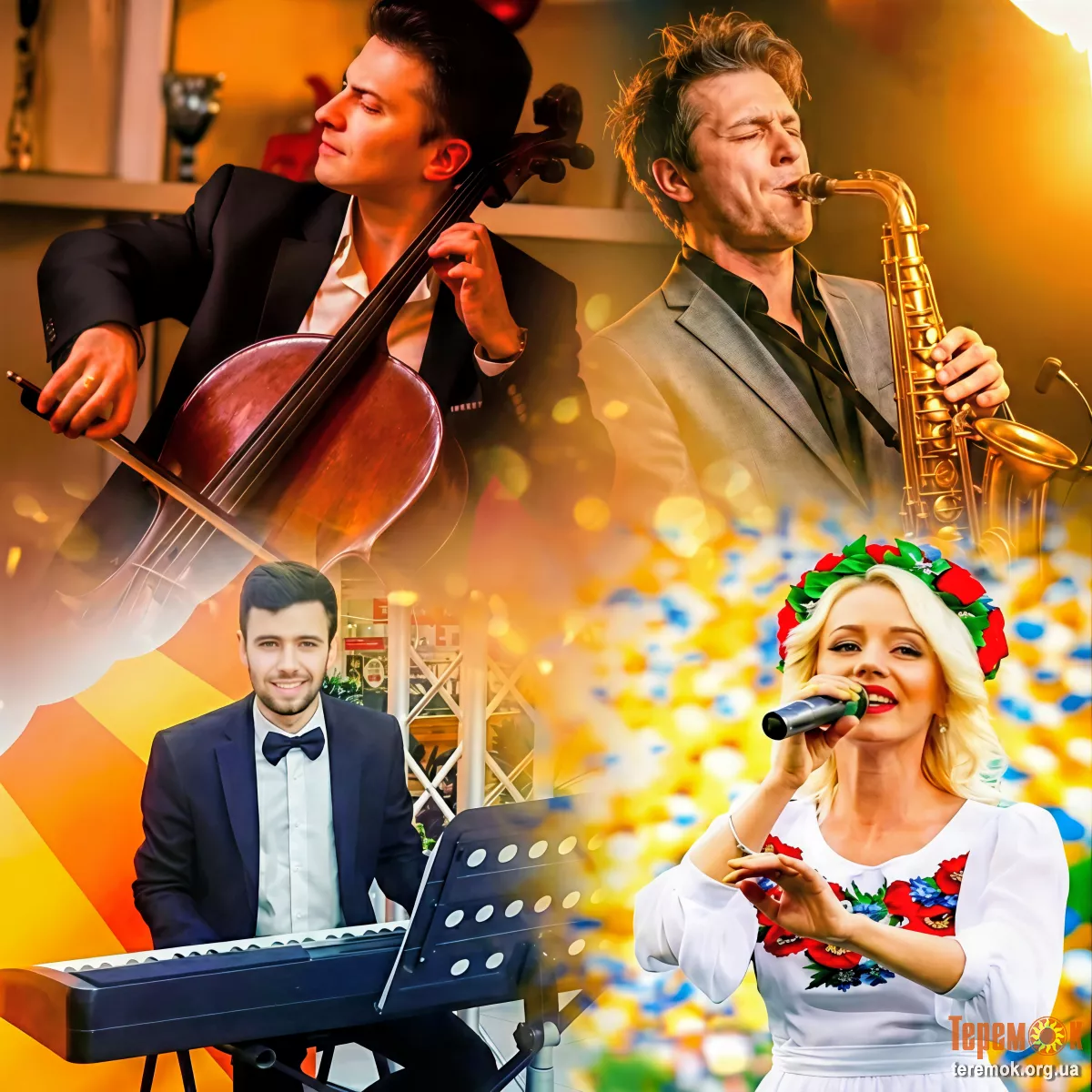 Скрипка, саксофон, піаніст, народні інструменти (баян, бандура), гітара, вокал, ведучий, DJ.