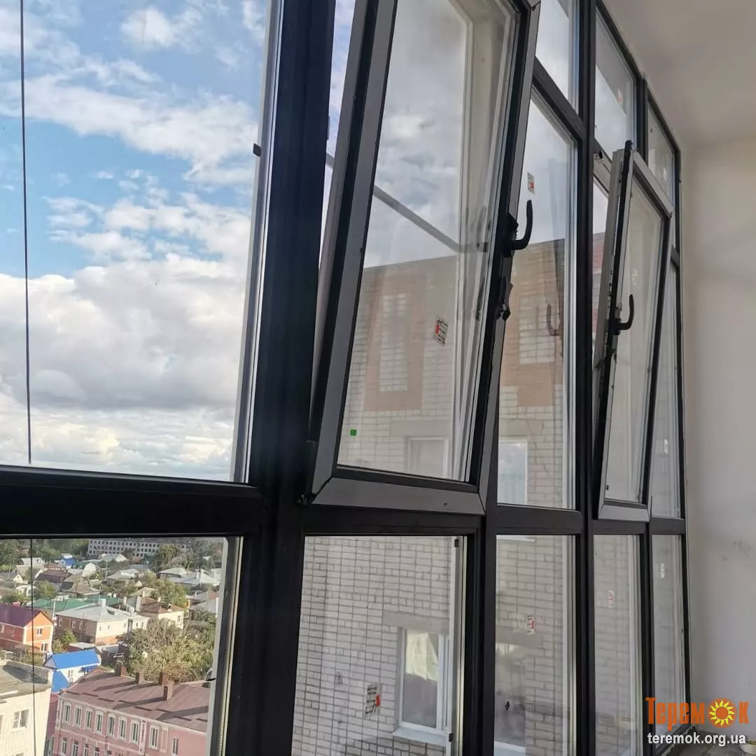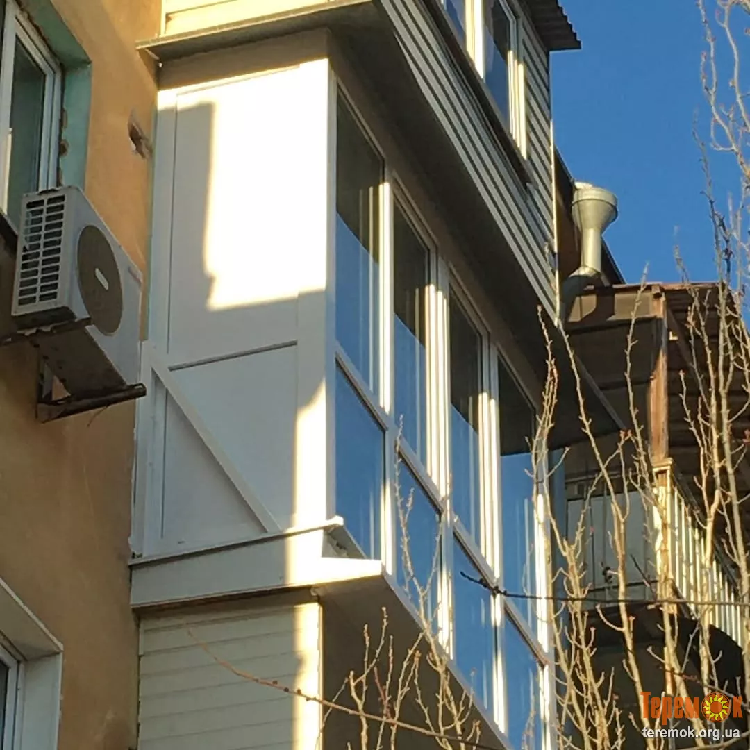 Купити скління для французького балкона, замовити панорамні вікна зі склопакетів у Кривому Розі. Скління балкона на всю висоту від підлоги до даху козирка — світлопрозорі французькі вікна. Можливе використання сендвіч-панелей.