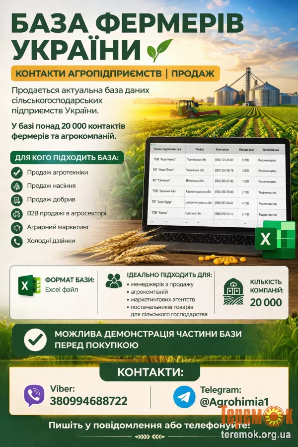 Продається актуальна база даних сільськогосподарських підприємств України. У базі зібрано понад 20 000 контактів фермерів та агрокомпаній з усієї країни, включаючи телефони, регіони та види діяльності. Формат надання — зручний Excel-файл, готовий для роботи та завантаження в CRM або для холодних дзвінків.