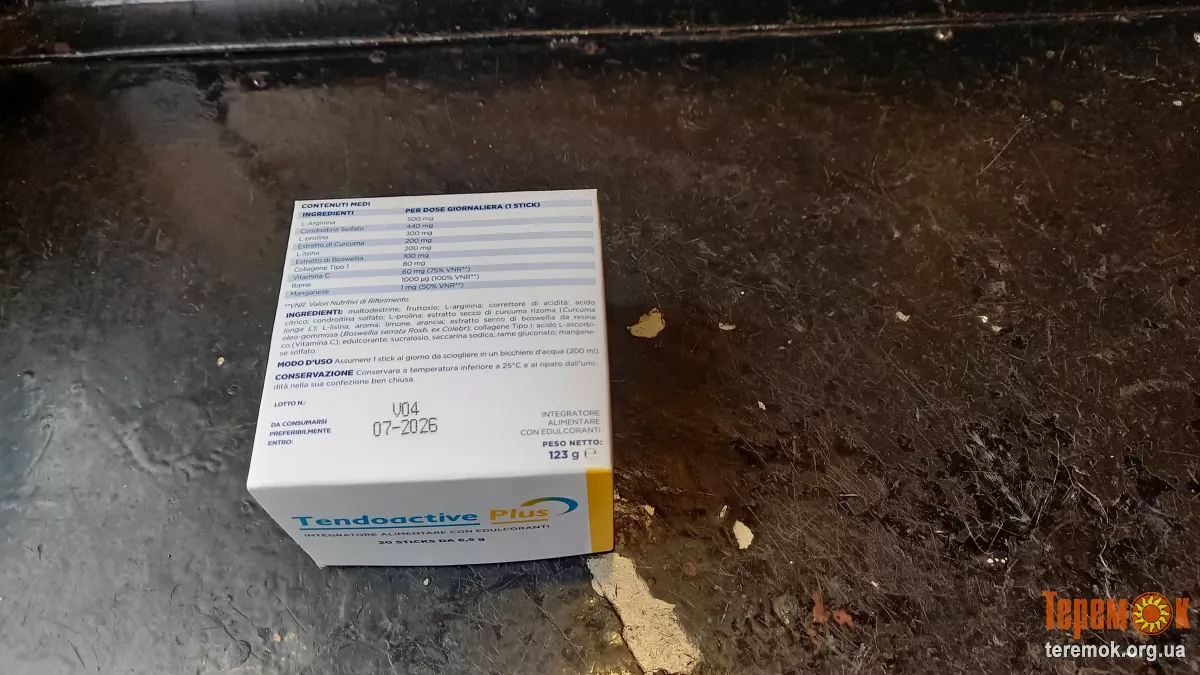 Биологически активная добавка Tendoactive Plus от Bruno Farmaceutici в 20 стиках: формула на основе L-аргинина, хондроитинсульфата, L-пролина, коллагена I типа, сухих экстрактов куркумы и босвеллии, L-лизина, витамина С, меди и марганца. Лимонно-апельсиновый вкус, без глютена и лактозы; принимать по 1 стику в день, растворив в 200 мл воды. Упаковка из 20 стиков по 6,5 г.